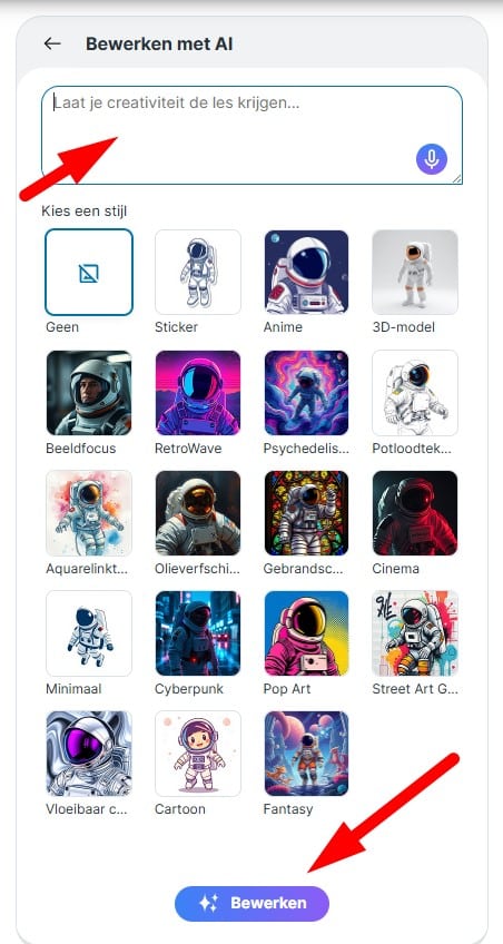 Vervolgens kun je zelf een prompt maken, zoals: “zet mijn foto om in een pentekening” of “maak er een lijnschets van”. Je kunt ook kiezen uit de vooringestelde stylen. Vervolgens klik je onderaan op bewerken.