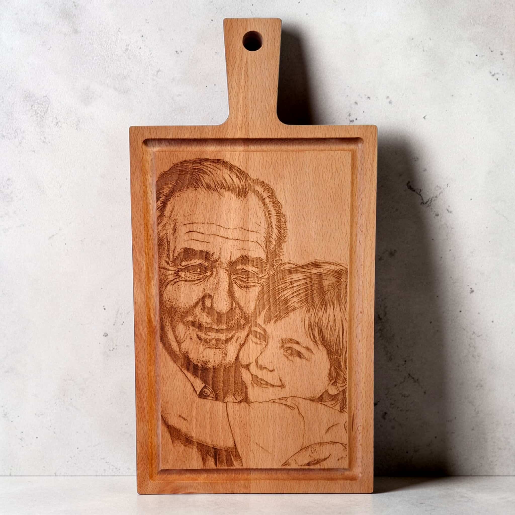 Wil je iets unieks? Gebruik de AI-optie en tover je foto om tot een potloodschets of lijntekening. Wij garanderen een haarscherpe, diepe gravure in het hout.